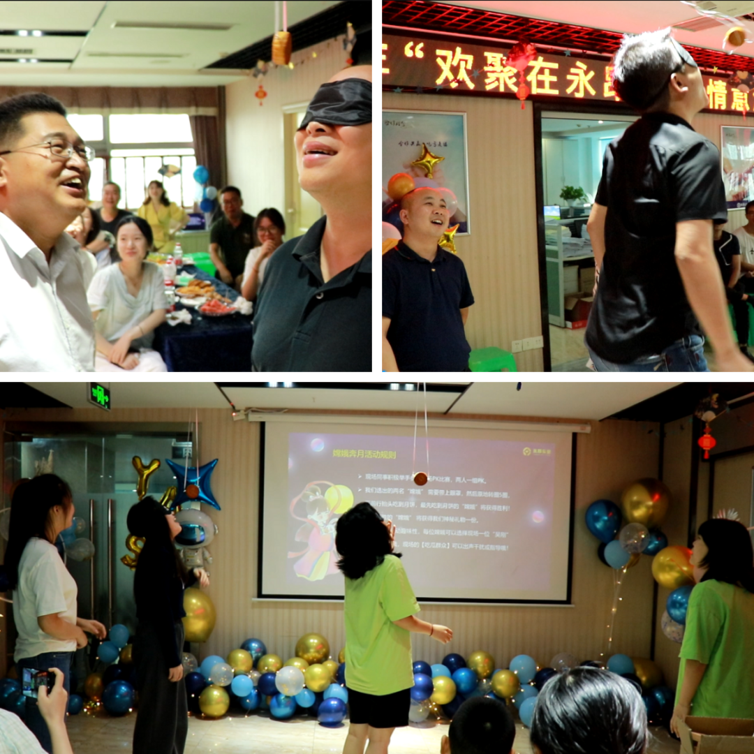 現場最歡樂的還是“嫦娥奔月”的小游戲,公司的男女“嫦娥”們在自己選定的“吳剛”的幫助下,躍起吃到懸掛的月餅,奔月成功。